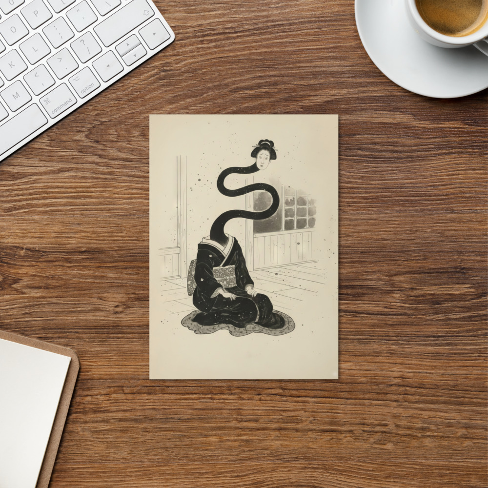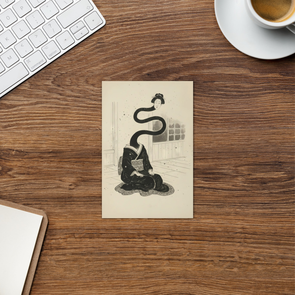 This ink-inspired design echoes the style of traditional sumi-e, with flowing lines and fine detail that capture the ghostly elegance of the Rokurokubi. Printed on premium matte cardstock and left blank inside, it makes a unique card for collectors of Japanese art, folklore lovers, or anyone drawn to the mysterious and supernatural.