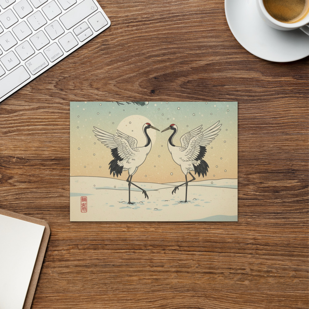 In Japanese and Zen symbolism, cranes are revered as emblems of longevity, peace, and fidelity. Their poised forms against the simplicity of snow and sky evoke balance, grace, and the quiet dignity of nature in winter. The presence of two birds suggests harmony and connection, making this image especially fitting for messages of love, friendship, or blessing.